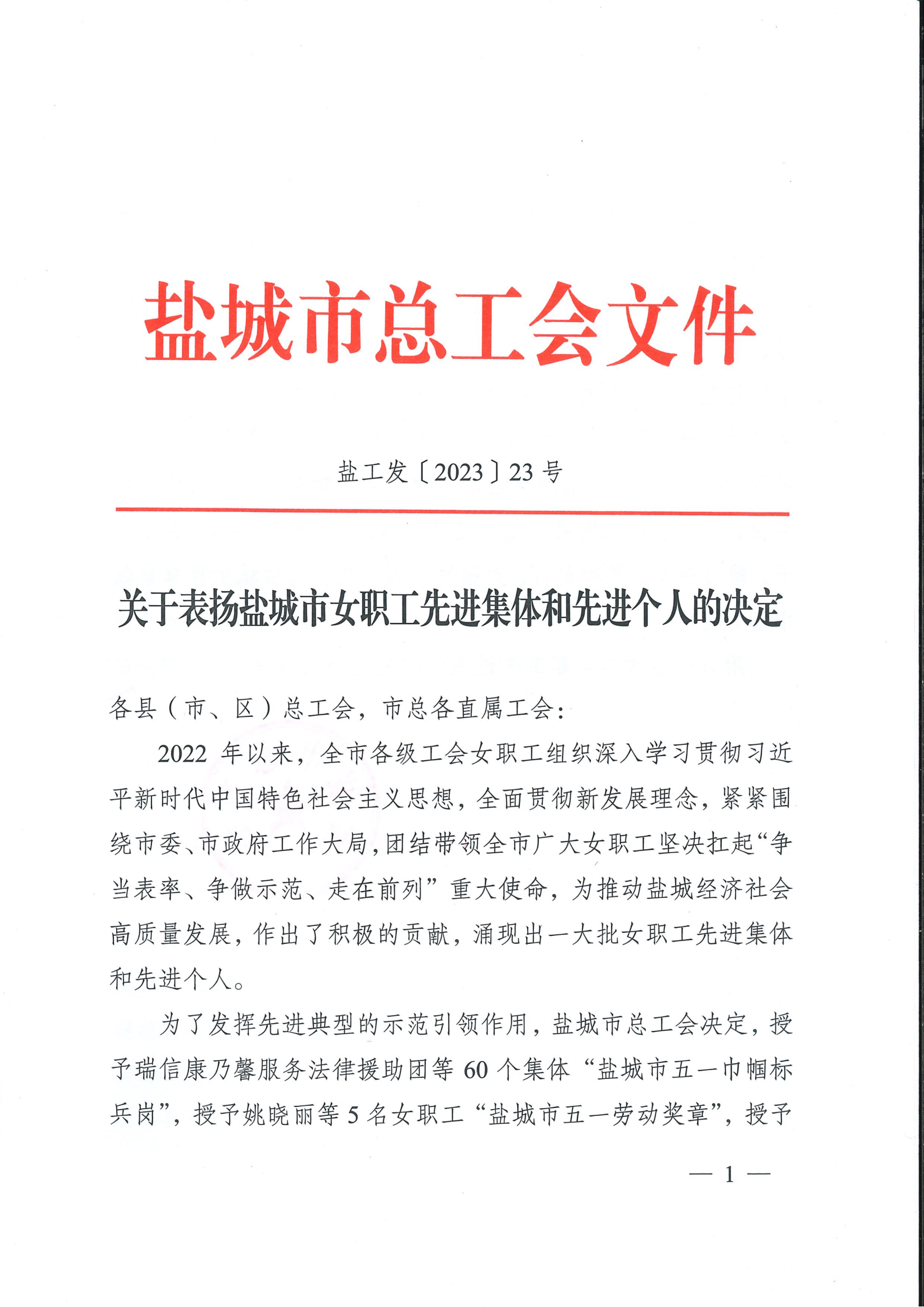 喜报!近日,盐城市总工会发布《关于表扬盐城市女职工 集体和 个人的决定》,城北开投公司计划财务部荣获盐城市五一巾帼标兵岗称号!
